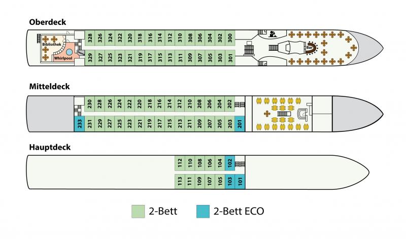 Alle Kabinen sind mit Dusche o. Badewanne/WC, Haartrockner, SAT-TV, Safe und individuell regulierbarer Klimaanlage ausgestattet. ECO Kabinen befinden sich im vorderen/hinteren Bereich des Schiffes (Beeinträchtigung durch Fahr- und Betriebsgeräusche möglich). Gerne nehmen wir bei Buchung Ihren unverbindlichen Kabinenwunsch entgegen, Angaben über Kabinennummern sind jedoch ausdrücklich kein Vertragsbestandteil.
